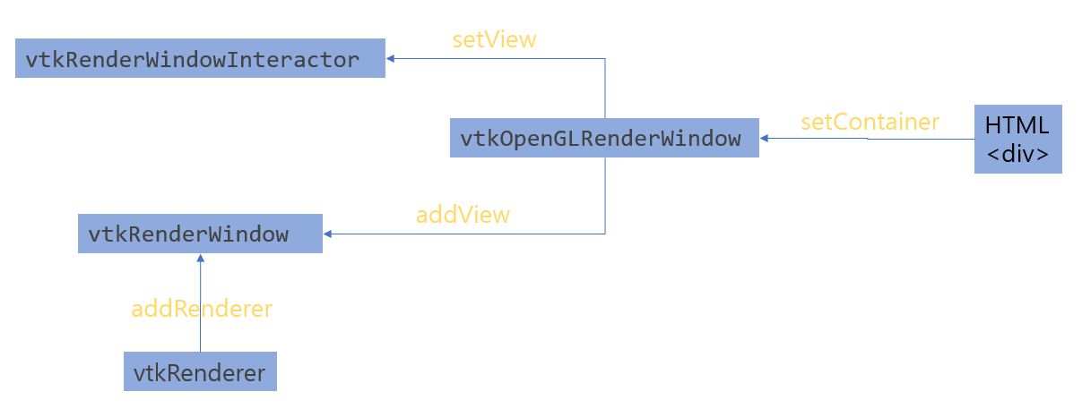 HTML의 div 태그는 먼저 vtkOpenGLRenderWindow의 setContainer 함수를 통해 설정됩니다. 그 후에 vtkRenderWindow의 addView 함수를 통해서 VTK 구조와 연결됩니다.