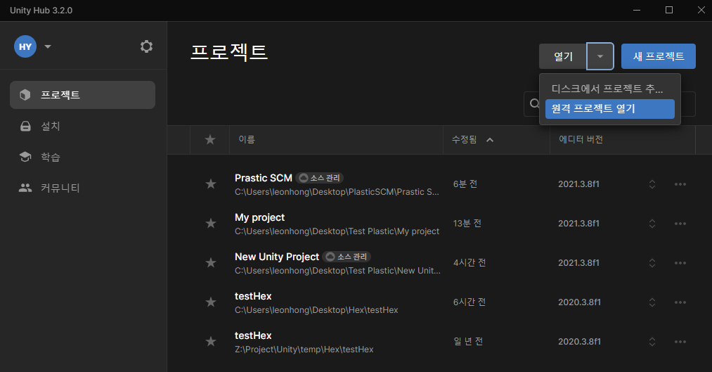 Unity Hub(3.2.0 버전)에서 프로젝트 열기 -> 원격 프로젝트 열기를 클릭