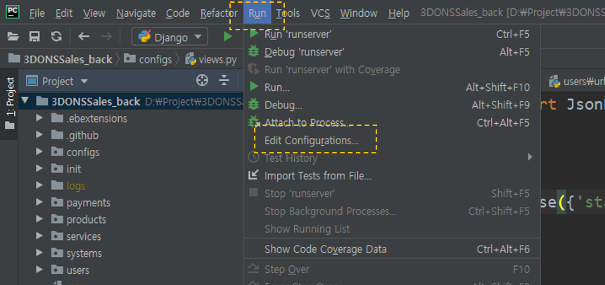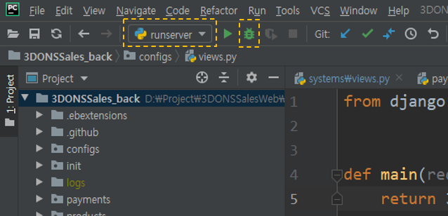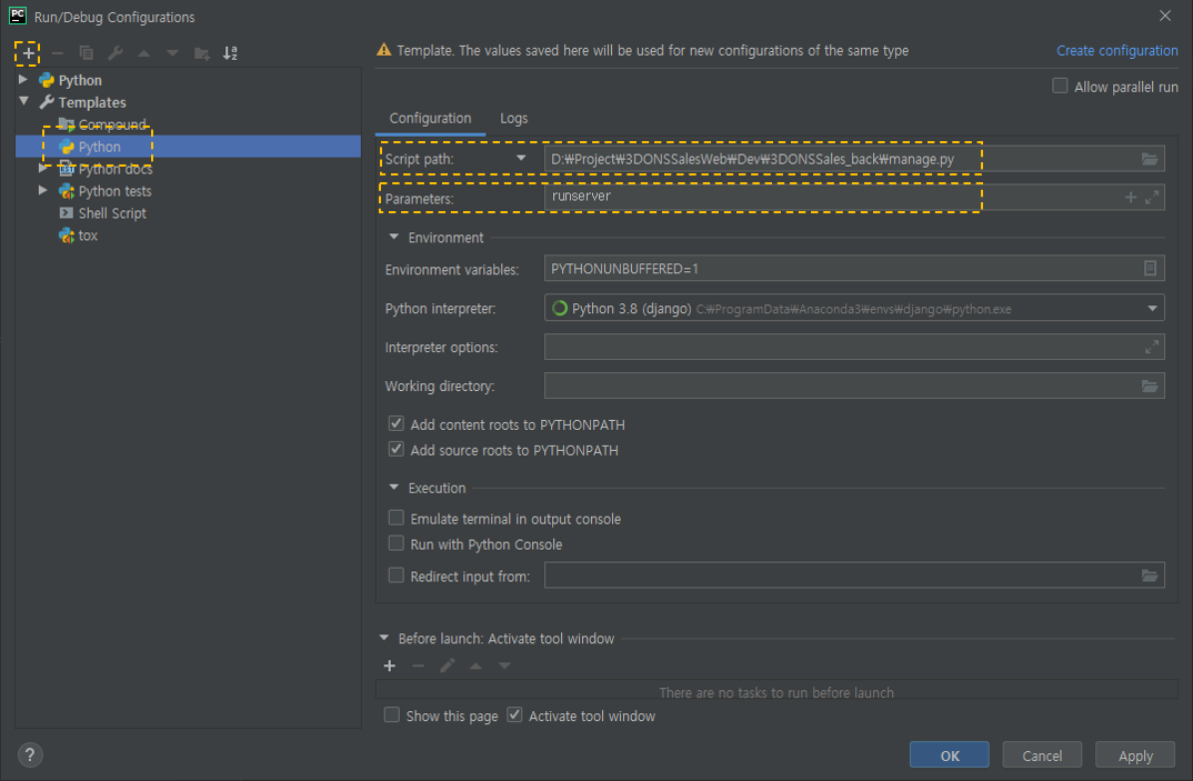 - Parameters에 runserver 입력