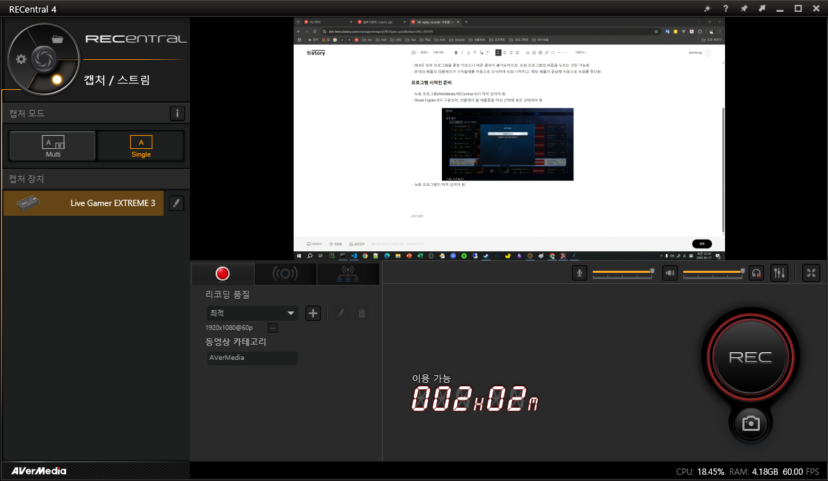 - 녹화 프로그램(AVerMedia RECentral4)이 켜져 있어야 함.